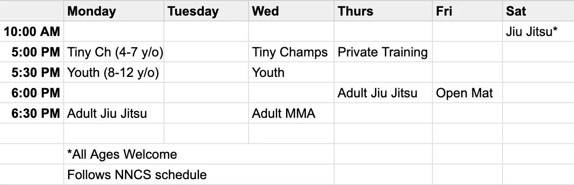 If NNCS cancels school or after-school activities due to weather then all classes are canceled. There may be an open mat offered pending weather conditions